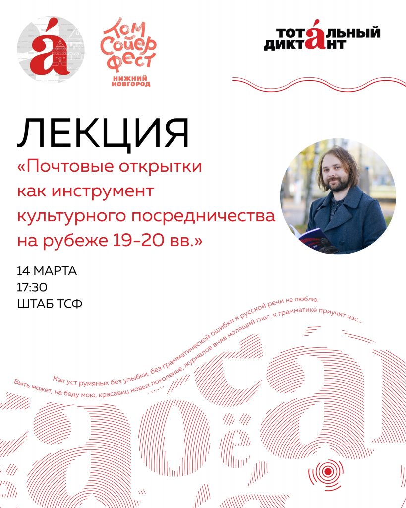14 марта в пространстве Штаба Том Сойер Фест в Нижнем Новгороде состоялась лекция «Почтовые открытки как инструмент культурного посредничества на рубеже XIX–XX веков». Встреча прошла в рамках подготовки к Тотальному диктанту.
