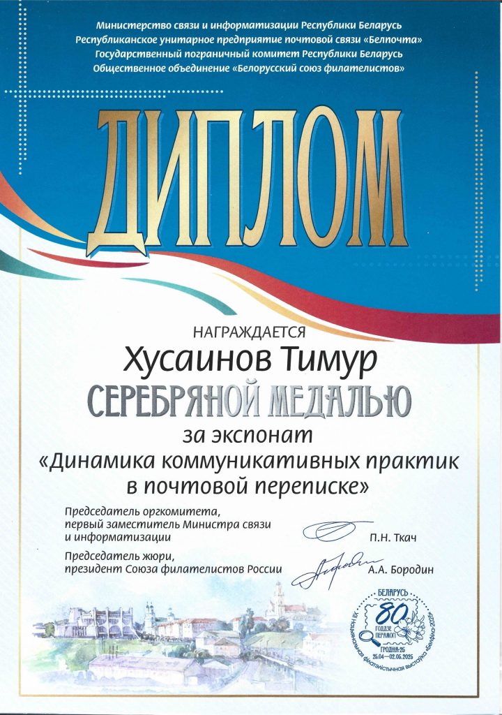 Серебряная медаль. XII национальная филателистическая выставка «Белфила — 2025»
